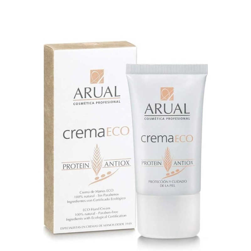 CREMAECO De la Crema ARUAL Clásica nace la CremaECO de manos. Como sucede con la CREMA ARUAL Clásica, puede aplicarse como crema corporal, obteniendo una nutrición y protección máxima de la piel. Ingredientes: PROTEÍNAS DE TRIGO Y DE SOJA: Aporta a la piel los nutrientes necesarios para su renovación natural y ayudan a la mejora del metabolismo celular con el objetivo de mitigar el envejecimiento natural de las células. EXTRACTO DE UVA: Como antioxidante, rico en agentes antirradicales libres y por tanto inhibidores de la peroxidación lipídica. La acción de estos ingredientes ofrece una marcada actividad antiinflamatoria e inmunoestimulante. FILTROS SOLARES: Combinación de filtros U.V. químicos y filtros U.V. físicos, que protegen las células de la piel de la radiación ultravioleta del sol. Especialistas en Crema de Manos desde 1949