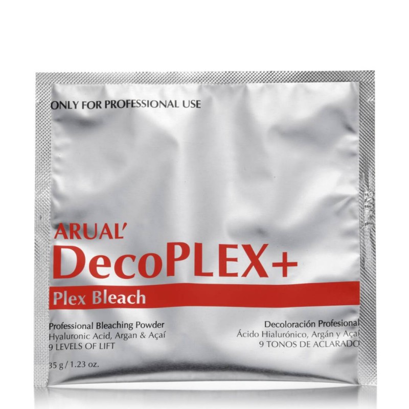 DECOPLEX Decoloración con Plex incorporado. Al tener Plex incluido en la formulación nos aseguramos en tener la máxima protección durante todo el proceso de aclaración, y de una reestructuración máxima. Tras el proceso de decoloración podrá observarse un cabello reestructurado, brillante y suave. DecoPlex nos permite alcanzar 8 tonos de aclaración en una sola aplicación. Está especialmente formulada para cabellos castigados y débiles que requieran un proceso de decoloración suave y progresivo, y a su vez una reestructuración capilar. Enriquecido además con ARGÁN, KERATINA y ÁCIDO HIALURÓNICO, los cuales aportan brillo, elasticidad y una máxima hidratación al cabello. En resumen, teniendo en cuenta su formulación DecoPLEX es un decolorante de última tecnología 3 en 1: blanquea, protege y deja el cabello perfectamente acondicionado. Instrucciones de uso: Mezclar decoPLEX con Oxigenada ARUAL en un recipiente no metálico, con la proporción 1:2. Dejar actuar en el cabello (seco, no lavado) hasta conseguir el nivel de aclarado deseado. Aclarar con abundante agua tibia y lavar bien el cabello.