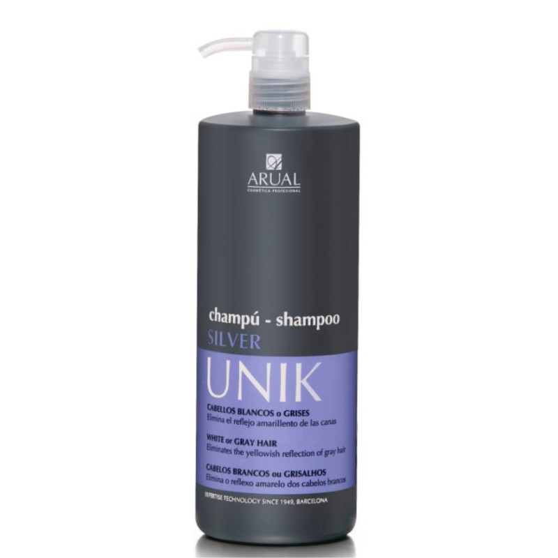 Línea Cabellos Blancos y/o Grises- UNIK SILVER Línea diseñada para eliminar los reflejos amarillentos no deseados en cabellos blancos y/o con canas. Indicado también para aquellos cabellos teñidos, decolorados, con mechas y/o rubios que se quieran contrarrestar los reflejos indeseados. Su fórmula contiene el exclusivo Extracto Proteico de Perla y pigmentos de alta gama que neutralizan los tonos amarillentos. Creado para: Eliminar los tonos amarillentos. Devolver a los cabellos grises y blancos su color original.a Contrarestar los reflejos amarillentos en cabellos: teñidos, decolorados, con mechas y/o rubios. Reestructura la fibra capilar aportando un brillo excepcional. SIN PARABENOS PRODUCTOS UNISEX CHAMPÚ SILVER Champú eliminador de los reflejos amarillentos no deseados en cabellos blancos y/o con canas. Indicado también para aquellos cabellos teñidos, decolorados, con mechas y/o rubios que se quieran contrarrestar los reflejos indeseados. Su fórmula contiene el exclusivo Extracto Proteico de Perla y pigmentos de alta gama que neutralizan los tonos amarillentos. Creado para: Eliminar los tonos amarillentos. Devolver a los cabellos grises y blancos su color original. Contrarestar los reflejos amarillentos en cabellos: teñidos, decolorados, con mechas y/o rubios. Reestructura la fibra capilar aportando un brillo excepcional. Modo de empleo: Aplicar sobre el cuero cabelludo y cabello, emulsionar, dejar actuar de 2 a 5 minutos según el grado de matización deseado y aclarar. Utilizar a diario para obtener los mejores resultados. SIN PARABENOS