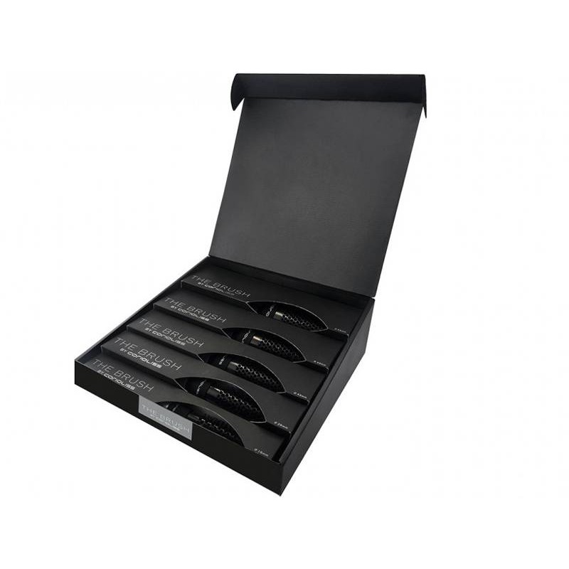 Descripción Este nuevo kit cepillos de cerámica termocrómica no puede faltar en tus trabajos de estilo. El barril cerámico con recubrimiento de turmalina y nanopartículas de plata, permite controlar la variación térmica: cuando la temperatura aumenta cambia de color. El material cerámico y las púas antiestáticas favorecen la emisión de iones negativos al calentarse el cepillo, ya que retiene el calor para un estilo perfecto sin encrespamiento. TIPO DE CABELLO: Con el Kit de cepillos Corioliss podrás trabajar con todo tipo de cabellos utilizando los diferentes tamaños de los cepillos incluidos en este Kit. MEDIDAS: Largo: 27,5 cm (Sin Púa) Diámetro: Ø 53. 43, 33, 25, 16 mm